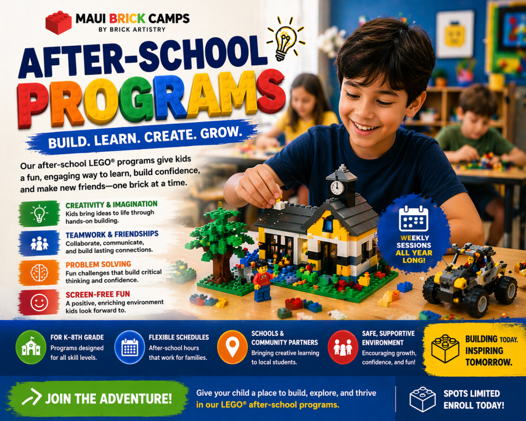 Maui Brick Camps after-school programs give kids a fun, hands-on place to build, create, solve problems, develop confidence, and connect with others through engaging screen-free learning experiences.