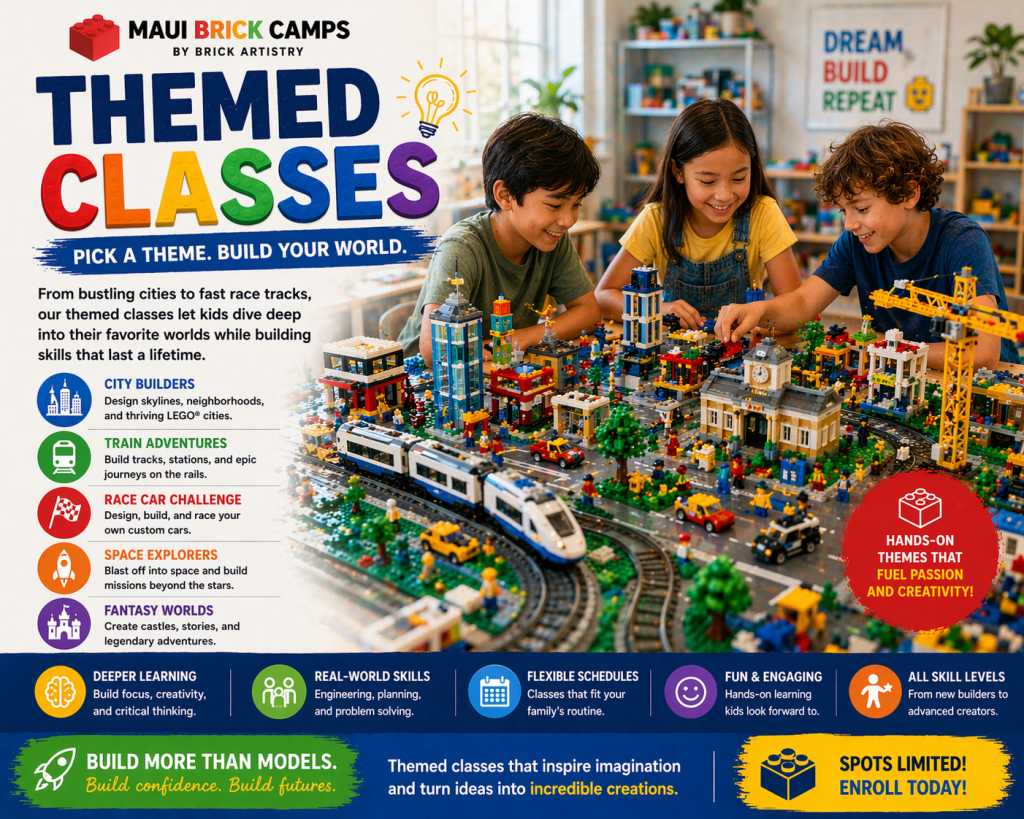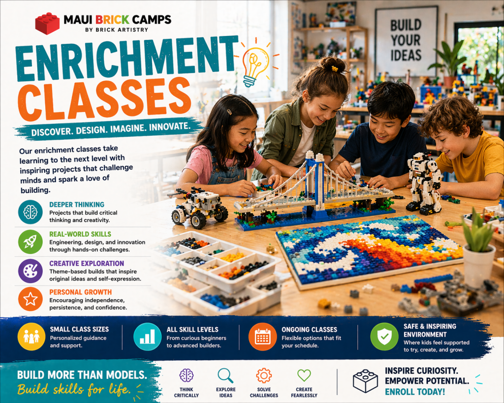 Maui Brick Camps enrichment classes are designed to extend learning through creative, theme-based building experiences that encourage exploration, innovation, and skill development in a fun and engaging environment.