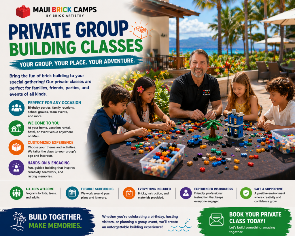 Maui Brick Camps private group building classes bring fun, creativity, and hands-on connection to families, friends, and special gatherings through customized brick-building experiences at your location or event. Perfect for Birthdays and visitors to Maui!