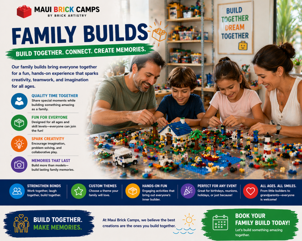 Maui Brick Camps family builds bring kids and adults together for fun, hands-on experiences that are perfect for birthdays, special events, family fun nights, and memorable time spent creating side by side.