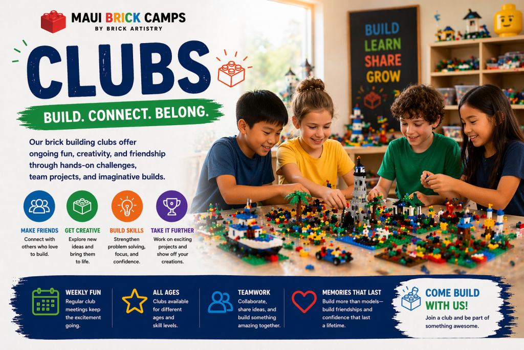 Maui Brick Camps clubs give kids a fun, welcoming place to build, create, explore new ideas, make lasting friendships, and grow their confidence through hands-on brick-building projects, creative challenges, teamwork, and imaginative experiences that keep them engaged, inspired, and excited to come back each time.